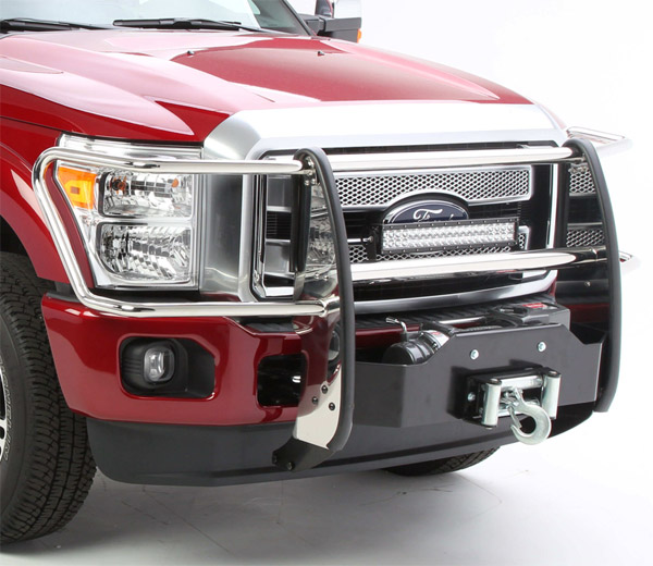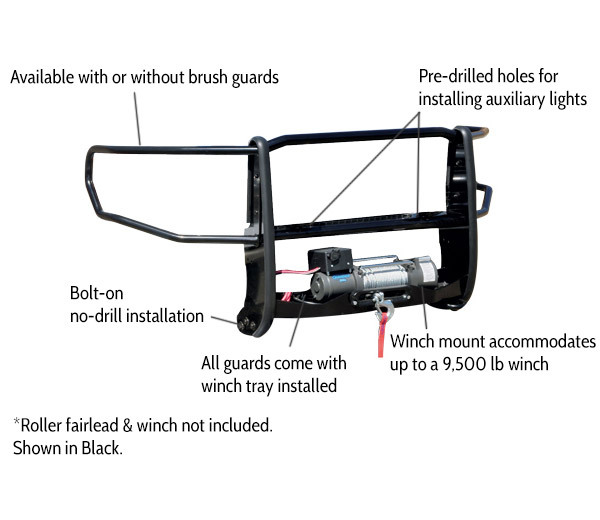 Whether you want a sporty look, heavy duty protection, or functionality out of your grille guard, Go Rhino offers a variety of guard options to fit your needs. The 3000 Series Step Guard offers a patented combination of rugged steel front-end protection and a handy bumper-level step for easy engine access. The Wrangler Guard is a solid, one-piece with heavy duty construction guard for extra protection. The Go Rhino Winch Guard features a built-in winch mount and has pre-drilled holes for installing 2 auxiliary lights for serious road warriors who demand extreme pulling power and toughness for any off-road situation.