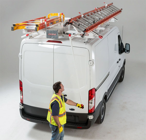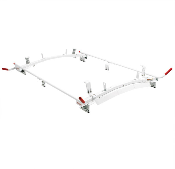WEATHER GUARD offers a variety of van roof rack options to suit every vehicle, trade or business need. All Purpose Racks come in 2 and 3 bar systems, with options to fit both fullsize and compact vans with rain gutters. EZGLIDE2 is a drop-down ladder rack system available for fullsize, compact and mid/high roof vans, with load capacities up to 100 lbs. Quick Clamp Racks are engineered to make loading and unloading your ladder an easy, one-person operation, with driver side, passenger side or dual side options. Lean the front of the ladder against the front hook and swing the back up onto the rack. Close the gas spring assisted Quick Clamp and you are ready to roll. The Safari Van Rack's unique oval rail design easily accommodates 4 ft wide loads and distributes up to 1000 lbs evenly over 8 cross members to protect the roof of the van.