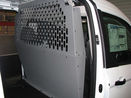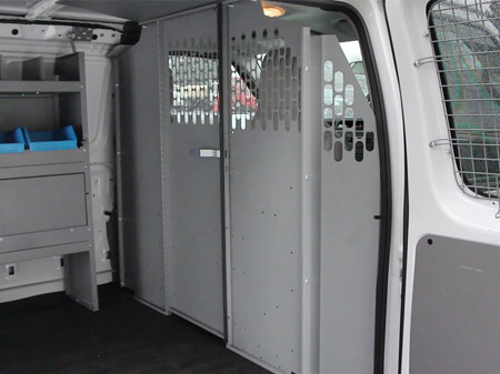 Kargo Master van partition bulkheads and wire window screens provide security for the van cargo area and protects your valuable tools and parts. With lightweight aluminum and heavy duty steel options for compact and full size vans, there is a partition available to suit your needs. A custom wing kit is also included that sets back the partition bulkhead to provide driver more leg room without losing floor space.